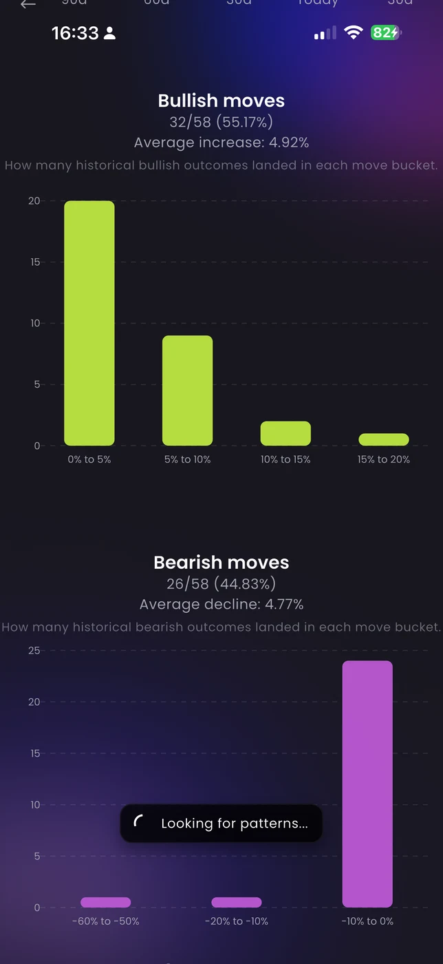 Look at bullish vs bearish counts, average move sizes, and scenario projections as probability frames — not forecasts. A 60% bullish match rate still means 40% of similar setups went the other way.