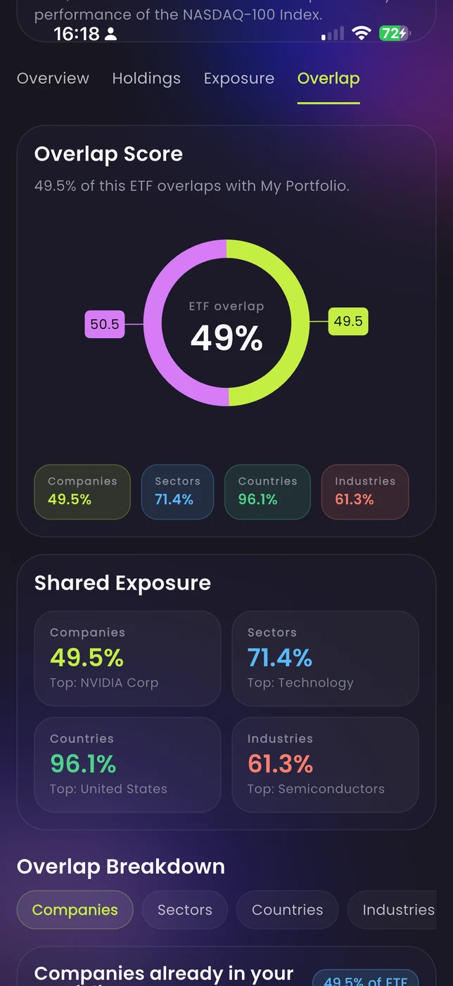 Compare any ETF against your portfolio across companies, sectors, countries, and industries.