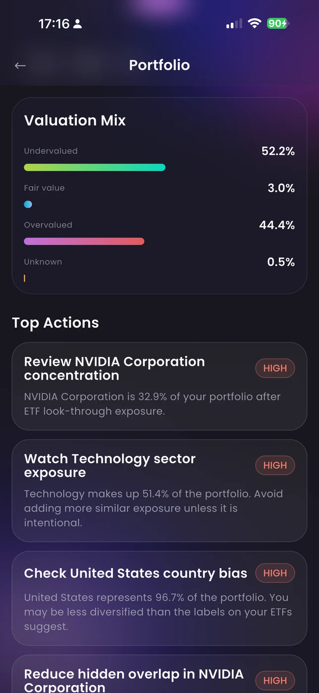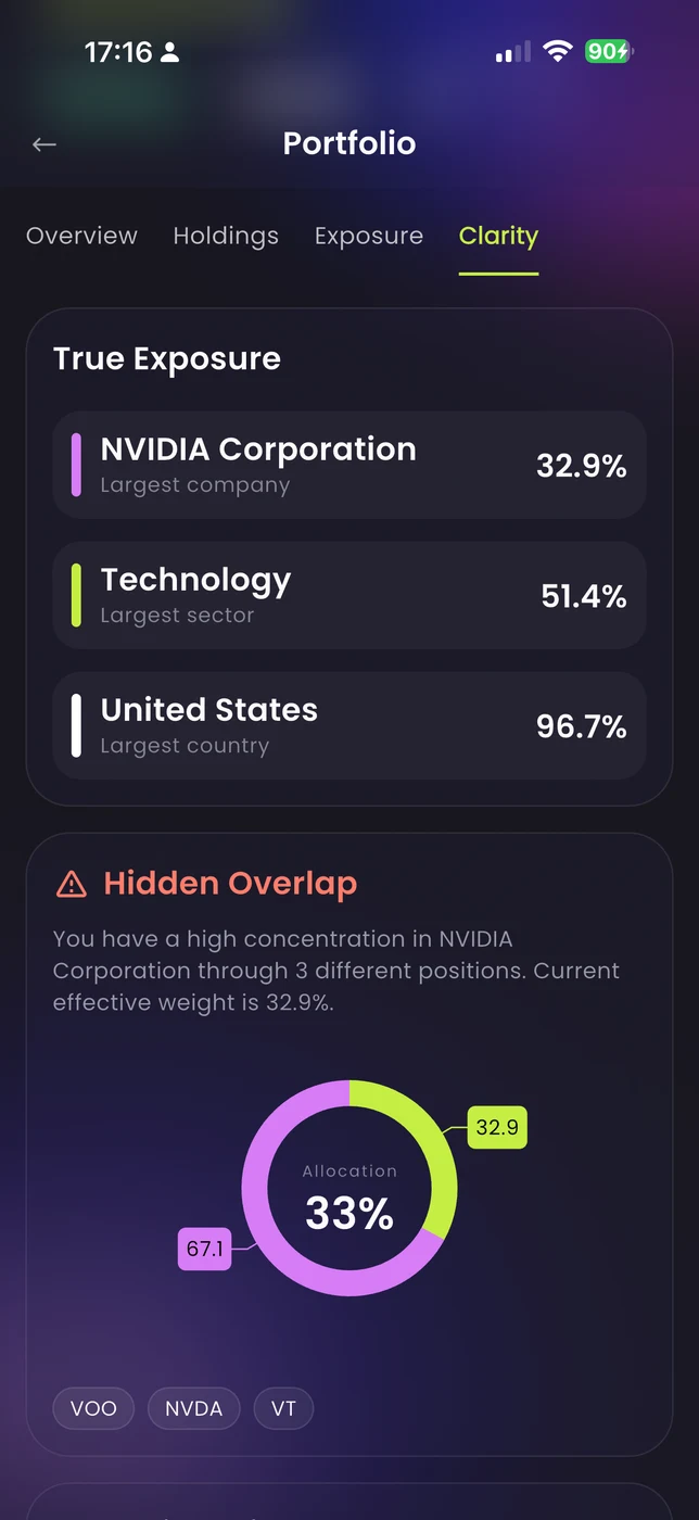We look through every ETF and layer to show your true company-level exposure, hidden concentration across funds, sector and country imbalances. Not percentages — actual risk.
