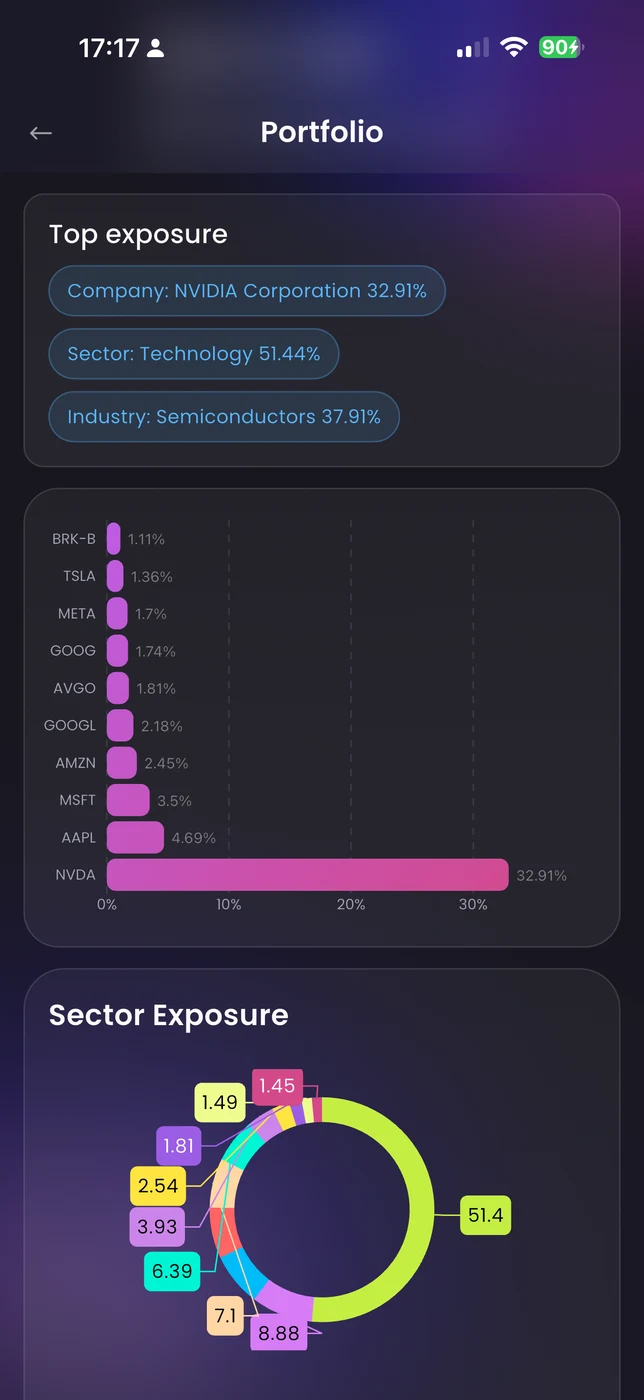 Direct stocks use company-level data. ETFs are broken down using fund holdings data weighted by your position size, so the exposure view reflects what you actually own across every layer.